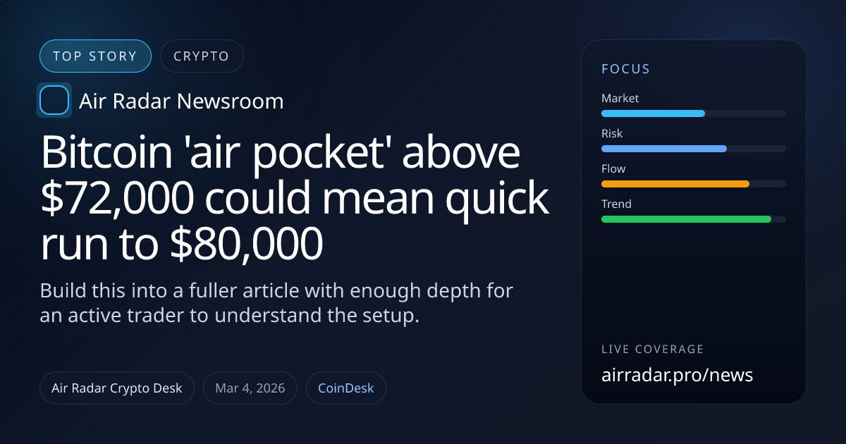 Current source notes point to the following context: Headline: Bitcoin 'air pocket' above $72,000 could mean quick run to $80,000 Category: Crypto Source: CoinDesk Published at source: 2026-03-04T14:58:25.000Z Reference URL: https://www.coindesk.com/markets/2026/03/04/bitcoin-air-pocket-above-usd72-000-could-mean-quick-run-to-usd80-000