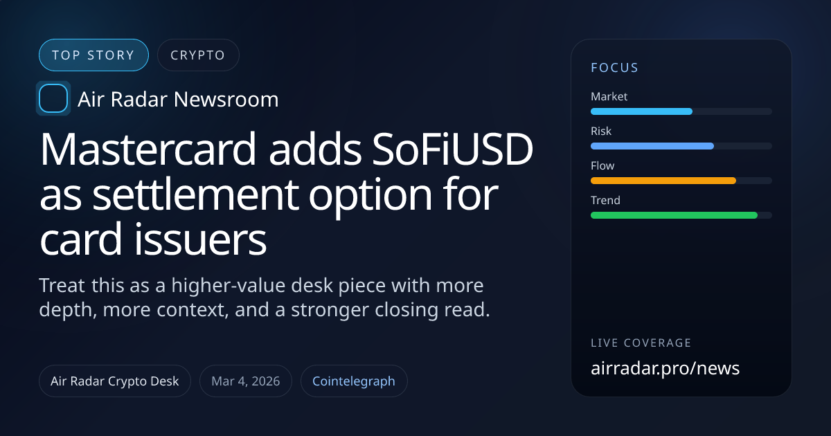 Current source notes point to the following context: Headline: Mastercard adds SoFiUSD as settlement option for card issuers Source summary: SoFi will enable Mastercard issuers to settle card transactions in its cash-backed SoFiUSD stablecoin across the global payments network. Category: Crypto Source: Cointelegraph Published at source: 2026-03-03T18:03:21.000Z Reference